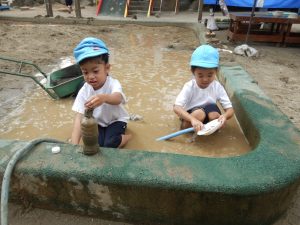 泥んこ遊びをする前に、「服、着替えてくる!」と気づいて泥んこの服に着替える子もいます。4月からの生活で身についてきていますね。汚れた服のお洗濯、いつもありがとうございます。