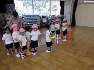 遊戯室でリレーをしました!一度園庭で年中、年長児と一緒にリレーをしたことがあったため、なんとなくやり方が分かっている子もいましたよ。自分のチームを自分で決めて一列に並んでいました。走りたいという気持ちが伝わってきますね。バトンを持って走ることや、そのバトンを友達に渡すことが楽しいようで、何度も何度も繰り返し走ることを楽しんでいました!風を切って思い切り走ることって気持ちいい!友達が走っている時も、「頑張れー!」と応援する姿もありました。みんなで走ることって楽しいね!