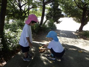 また、木曜日には初めて思い出の森にみんなで探検に出かけました!階段やロープのトンネルから登ったり、滑り台を滑ったりしました。また、森にある葉っぱを友達と一緒にたくさん集める姿も見られました。新しい場所には新しい発見がたくさんありますね!