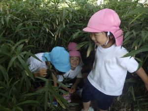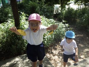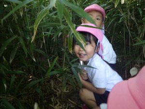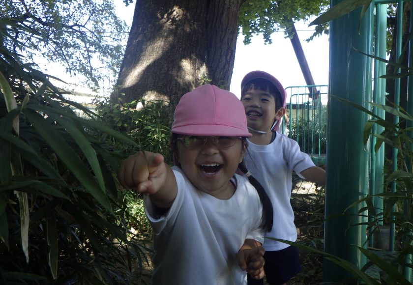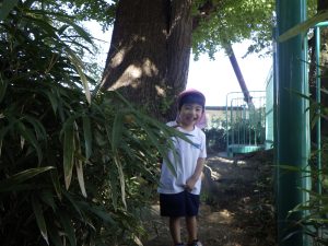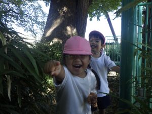 また、思い出の森でかくれんぼをしました!友達と一緒に狭い場所に隠れると、なんだかワクワクする!身を寄せ合ってこの笑顔です!「もういいかい」「もういいよ」とやりとりをすることも楽しんでいました。