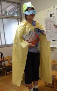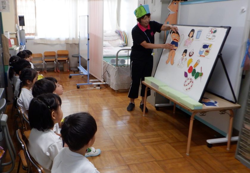 3,4歳児は音楽に合わせてパネルシアターで「ばななうんちにあうひみつ」について話しました。うんちマンに変身し歌いながら進んでいきます。5歳児には絵本を読みながら「5つの術」を使うことですっきりうんちを出せるように話をしました。