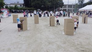 カナダパビリオン「見つからないようにかくれるよ!」では、おうちの人に見つからないように一生懸命隠れていましたね。ドアから家の中に入っていく様子や、家の中でじっと待っている様子、見つかった時の笑顔がとても可愛らしかったですね!普段は先生と一緒にこのかくれんぼを楽しんでいましたが、今回はおうちの人に見つけてもらえるので、子ども達はいつもの何十倍もワクワクした表情でした!
