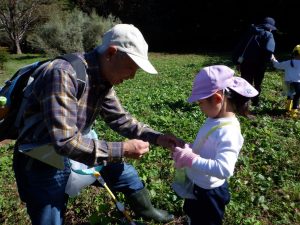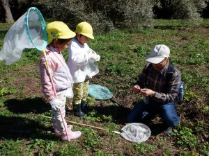 名和先生にその場で虫の名前や特徴を教えていただくことで、それを聞いた子どもが、「このバッタは羽根が赤いんだよ(アカハネオンブバッタ)」と別の友達に話したり、「〇〇(氏名)も欲しい!」と見つけようと一生懸命に草むらを見たりなどする姿に繋がっていきました。