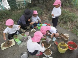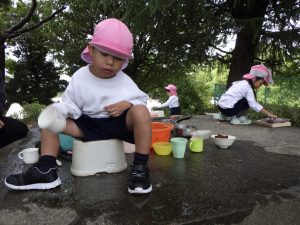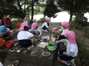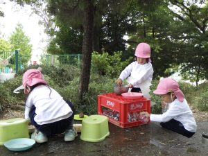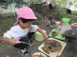 そんな自分で見つけた素材を使って、思い出の森でごちそうを作ったり、先生や友達と集ってパーティーをすることを楽しんでいます。自分たちで好きな皿や必要な道具、椅子などを持っていき、パーティーのために準備をしています。土と砂を混ぜてスープを作ったり、色水でジュースを作ったり、土をケーキに見立てて、秋の自然物を飾ったりなど、素材を見立てながら遊ぶことを楽しんでいます。どの子のごちそうも、その子なりのこだわりがあり、とても面白いです!