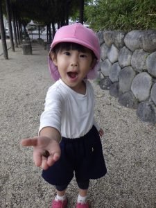 思い出の森の近くでどんぐりをたくさん見つけました。割れていないツルツルのどんぐりを見つけてこの表情です!どんぐりを見つけると、宝物を見つけたかのようなワクワクした気持ちになりますね。