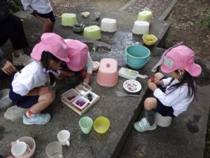 使いたい道具や、実があると、子ども達同士で「貸してくれない?」「1個いいよ」や、「後で貸してあげるね」などと物の貸し借りをする姿が増えてきました。場を共有して遊ぶ中で、友達と一緒に使う姿が増えてきており、成長を感じます。