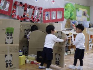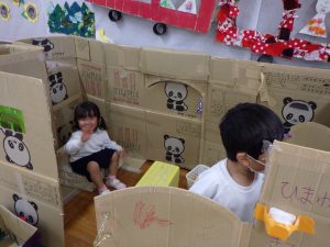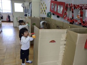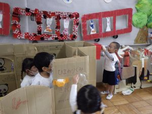 保育室では、親子ふれあいフェスティバルのかくれんぼで使用した家を繋げ、大きな家をつくりました。