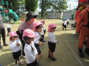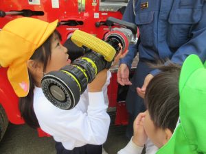消防車の中も見学させていただいたり、実際にホースの先端を持たせていただいたりしました。