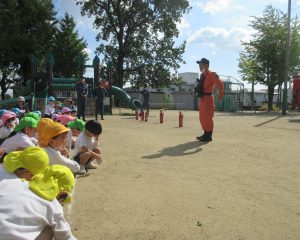 普段の遊びの様子から見ていただき、火災が起きたという想定で訓練を行いました。