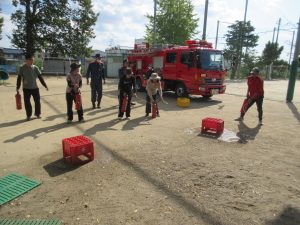 先生たちも消火訓練を行い、万一の場合に備えて、日ごろから消火器の使い方をどの職員もが知っておくこと、消火器の設置してある場所を確認しておくことの大切さも学びました。