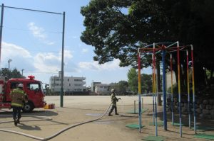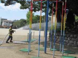 また、消防士さんが実際に火災現場に到着したという想定で、思い出の森に消火活動する姿も見せていただきました。