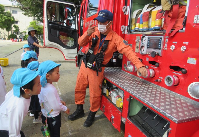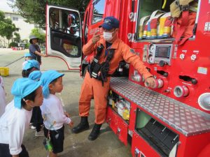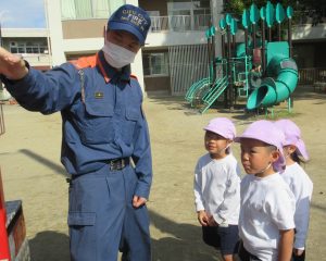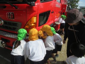 消防士さんから、火で遊ばないこと、火事が起こったら先生の話をよく聞いて非難することが大事であるというお話を聞きました。