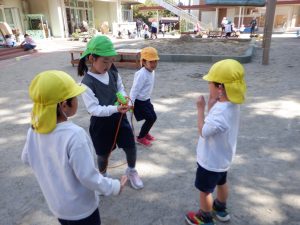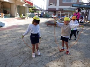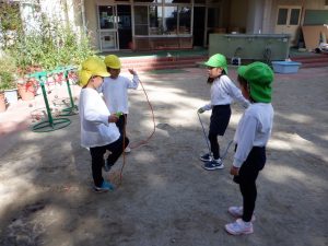 戸外では、運動会プレゼントの縄跳びに挑戦しようとする姿が見られます。