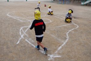 だんだん、ラインの上をそれぞれが走りながら、途中で友達と出会えたらジャンケンポン!のルールに。