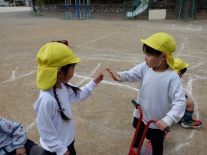 「さいしょはグー、ジャンケンポン!」の掛け声を2人で合わせて、タイミングよく手をだすことも、大事な経験ですね。