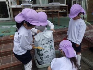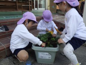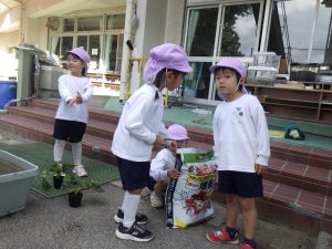 いちごの苗植えのために、自分たちでプランターに土を入れました。