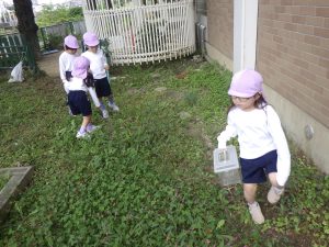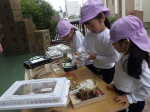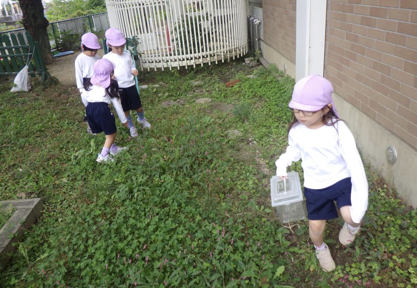 先週の虫の世界から連れて帰ってきたバッタやチョウについてみんなで考えました。すると、一人の子がカマキリの「ママちゃんの餌にしたい」と言いましたが、他の子はみんな「飼いたい!」と自分で捕まえた特別感が大切にしたい気持ちで意見がぶつかりました。カマキリを大切に思う気持ちと、捕まえたバッタを大切に思う気持ちと、どうなるかなと見守っていると、ある子が「じゃあ、この大きさのバッタ公園で捕まえてくるから、それをママちゃんにあげて、このバッタは飼うのはどう?」と言ってくれました。すると「それなら良いよ!飼おう!」とみんな納得して、飼うことになりました。