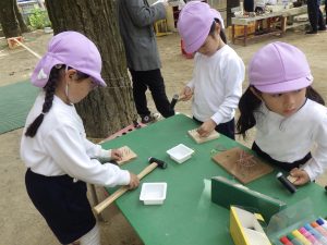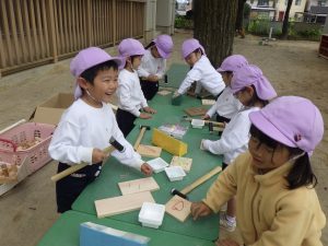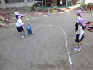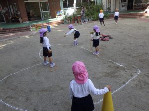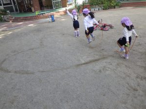 ハートの真ん中まで来たら、次の子がスタートね!とルールを考え、楽しく繰り返し縄跳びで遊んでいます。だんだん滑らかに回す姿があるので、リズムよく跳ぶようになる日も近いのかな?と嬉しく思います。