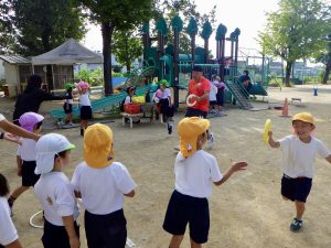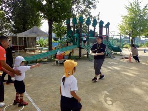 みんなでかけっこや一輪車、竹馬、サッカー、綱引きをしました。みんなが自由にやりたい遊びをしてる姿がいいと思いました。元気な子ども達と遊べて楽しかったです。ありがとうございました。