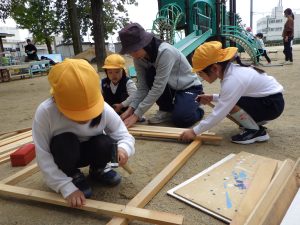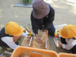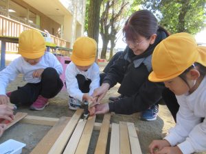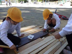 さくら組の子たちは、机や椅子を個々で作っているのですが、いちょう組の子たちはそこにはあまり興味がないよう・・・。