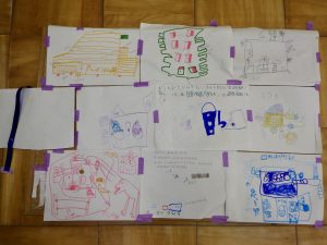 すると「かわいい家。」「かわいいってどんな家?」「リボンとかハートとかが付いていたり・・・。」「こんな感じ?」1人の子がスケッチを描き始めたことをきっかけに、それぞれがイメージ図を描き始めました。