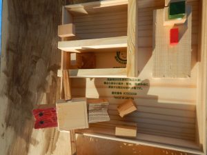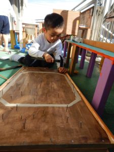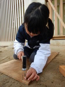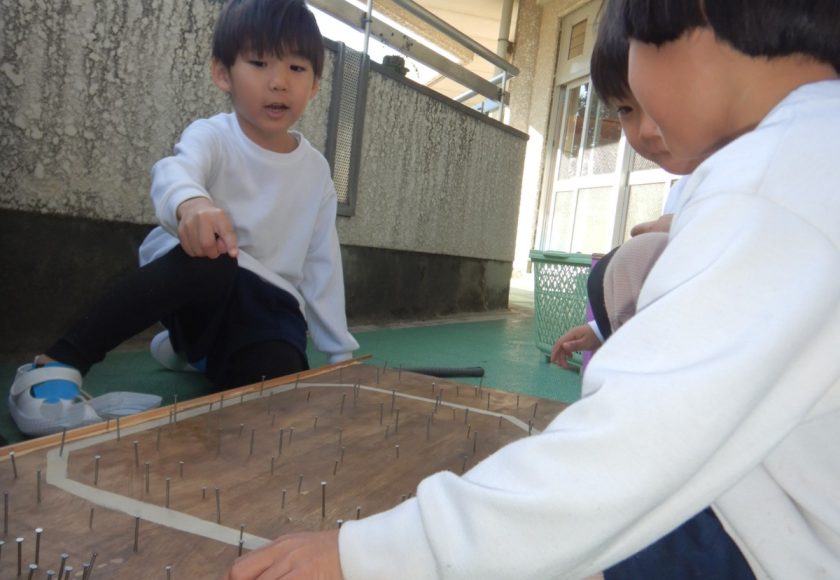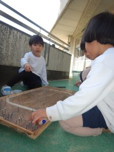 幼小交流のお土産でもらったビー玉を、皆で釘打ちした板に転がすと