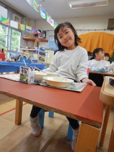 自分たちで作った椅子と机で食べる給食は絶品のようです。
