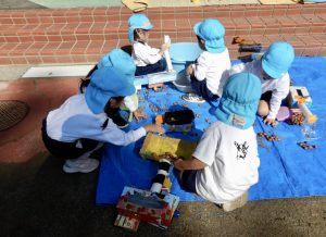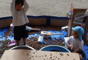 手作りの重機は、片付けの時も大活躍で、みんなでたくさんのドングリを集めました。