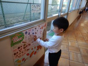 「あっ、これ!」と木の実を持って廊下に走っていく子がいました。向かったのは、秋の自然物のポスターです。「これだー!同じ!」そこに書かれていたのは、「トチノミ」です。「なんで、わかったの?」と聞くと、「手洗いに行く時、いつも見てるから。」とのこと。実物とポスターの写真が結びつきました。トチノミは、触るとツルッとしていて気持ちいいです。