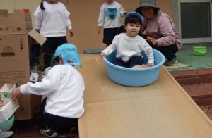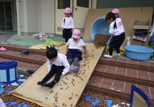 ドングリをダンボール板や滑り台に流して、感触や音、動きを楽しむ姿が見られます。友達や教師と一緒に「いちにーの、さーん」と掛け声をかけて流すと、「ざー」っと音がしたり、金ダライに「ゴンゴン!」と落ちていったりして、とてもおもしろいです。