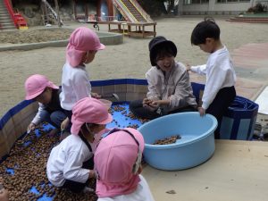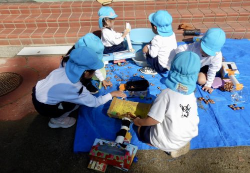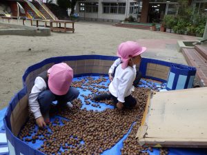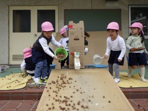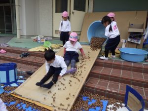 片手桶やバケツを用いてどんぐりを転がします。「ゴロゴロゴロ」と音がすることが面白い!たくさんのどんぐりが転がる様子が面白い!みんなで一緒にどんぐりを転がすことが面白い!たくさんの面白いを見つけることができました。