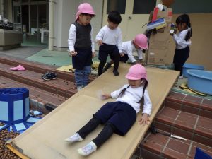 どんぐりが転がっていく姿を見ていたら、自分たちも滑りたくなってきちゃった!勢いよくどんぐりの中へダイブ!「ツルツルしてるよ!」「ゴツゴツしていてちょっと痛いね」と、感触を味わっていました。
