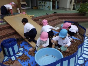 また、どんぐりを一生懸命集めて、大きなたらいにたくさんのどんぐりを入れている姿がありました。「上まで持って行きたいんだけど重たくて運べない・・・」重たそうにしている姿を見て、一緒に流したい他の子が駆けつけてくれました。力を合わせて上まで運び、一緒に大量のどんぐりを流していました。力を合わせて運んだ大量のどんぐりを流すと、迫力満点です。