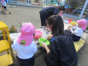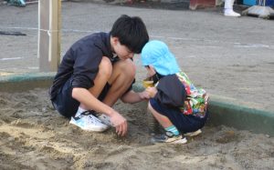子どもたちの目線に合わせて体をかがめ、一緒に泡クリームを作ってくれたり、砂場で遊んでくれたりなどする中学生の皆さん。
