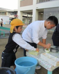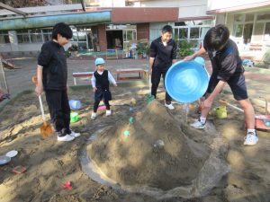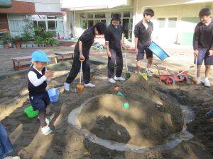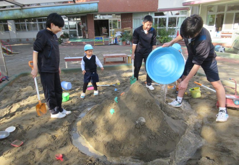 子どもたちの『砂場に山を作り、その山の周りに水を流したい』という思いを叶えてあげようと、中学生の皆さんがタライを使って、一気に水を流し込んでくれました。