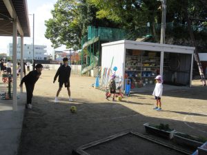 ボール蹴りを一緒にしてくれた中学生の皆さんは、幼児が蹴りやすいように、速度を考えながらボールを蹴り返してくれていました。