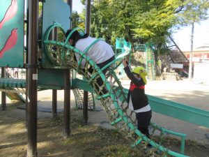 幼児用の遊具のネットクライムをくぐる際、中学生の方は自分の大きな体をかがめながら、子どもの後を追い、一緒に遊具で遊んでくれたり、