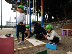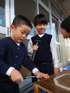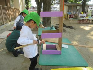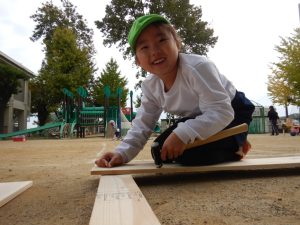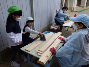 園長先生や教頭先生にやすりで削ってもらった木を使って