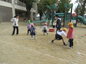 しっぽを自分につけている間に、友達にしっぽを取られてしまって涙が出てしまったという子がいました。「もう嫌だ!」と悲しくなって逃げ出したくなってしまうような時に、いちょう組の子が「どうしたの?」と優しく話をきいてくれました。いちょう組の子に悲しくなってしまった理由を話すと、「そうだったんだね、じゃあ、しっぽをつけている時は取るのをやめよう。それならもう一回できる?」と優しく気持ちを受け止めてくれたので、また笑顔でしっぽ取りに戻ることができました。