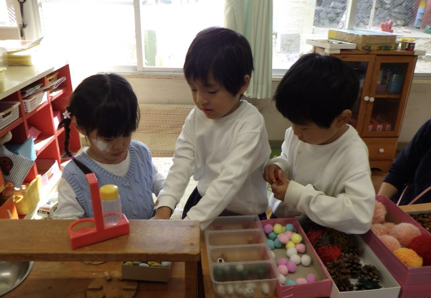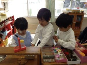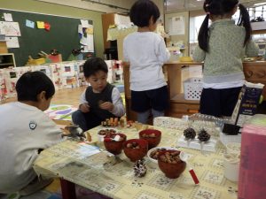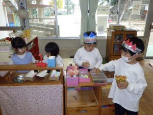 どんぐりを使ってどんぐりごはんを作ったり、ポップコーンを作ったりしています。「ごはんできたよー」と役になりきって遊ぶ姿も見られますよ。また、自分の好きなものを身につけてごっこ遊びをしている子もいます。子どもたちのイメージはどんどん膨らんでいますね。