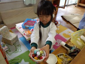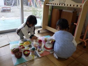 保育室では、自然物や様々な素材を見立ててごっこ遊びをすることを楽しんでいますよ。