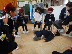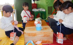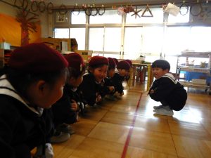 帰りの会では、子どもたちの”こんなことをしたい””これを伝えたい”という時間が盛り上がっています。クイズ遊び、変身ゲーム、真似っこ遊び等を自分たちで進め、楽しくなるように考えたり、色々な考えに触れる面白さを味わっています。
