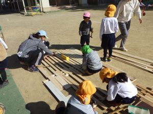 秘密基地という響きや、自分たちで作った場所で遊ぶ感覚の面白さを知った子どもたちは、遊戯室にもお家を作ろうと動き出しています。