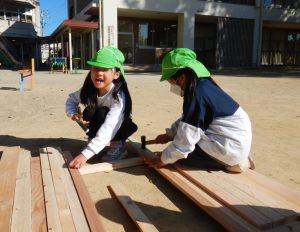 「自分の(背の)高さにする」など、それぞれの目標をもち、友達と刺激試合ながら、何日もかけて作る姿が眩しいですね。根気よく取り組む姿が育ってきてます。