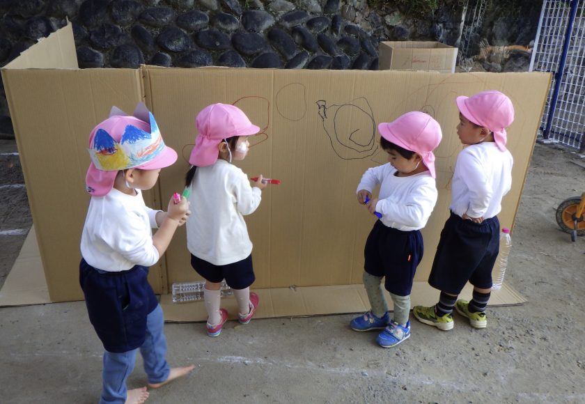 茶色の段ボールを見て、「茶色は嫌だから何か描きたい!」という話になり、みんなでペンで壁に絵を描きました。自分の好きな人や恐竜など、思い思いの絵を描くことを楽しんでいました。大きな段ボールに絵を描くのは特別な気分になれるようで、どの子も勢いよくペンを走らせていました。その中で、自分が絵を描きたいときに、他の子の絵に被らないように気をつけて、空いている場所を探している姿に成長を感じました。他の子が書いた絵も大切にしてくれていることが、とても嬉しく思います。
