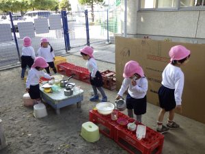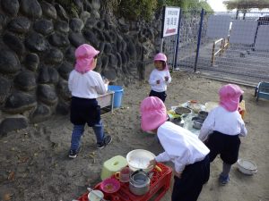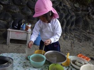 また、別の日には拠点を別の場所に移してごっこ遊びをしました。ごちそうを作るためにチョコレートを調達したり、スープを作ったりと大忙しです!