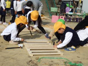 ドア作りは、壁を作った時と同様、木を繋ぎ合わせて釘と金槌でトントン!