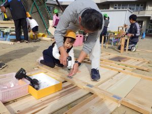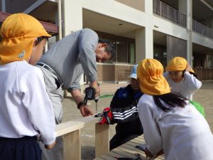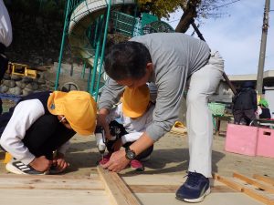 「最初はゆっくり、最後は強く。」とこつを教えていただきながら、安藤大工さんと一緒にみんな電動ドライバーを経験しました。