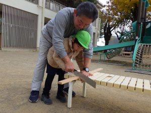 安藤大工さんは普段私たちが使っている椅子や机を指さして何が違うか聞いてくださると、「あっ、ここに柱がある!」と足と足の間に木が通っていることに気が付きました。