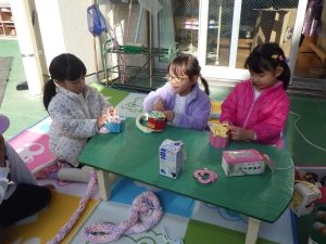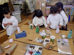 室内では、クリスマスもクリスマス楽しみ会も近づき、毛糸でツリー作りを楽しみました。好きな飾りをボンドで付けて、持ち帰れる日を楽しみにしてくれています。こちらも2、3個目を作って「今日持って帰る!」とワクワクしている子もいました。